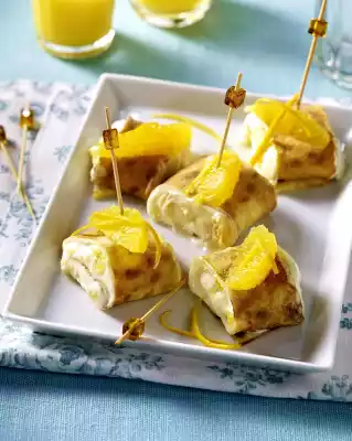 Spread the crêpes with ricotta cream, roll them up and refrigerate for about 1 hour. Cut crêpe rolls into 4 pieces each and decorate with orange fillets and strips.