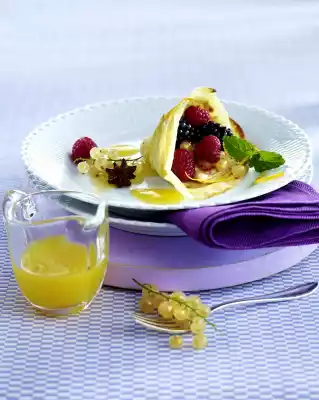 Add about 1/4 of the crêpe dough thinly, fry for 1-2 minutes on each side until brown. Keep ready crêpes warm. Bake the remaining dough in the same way. Fill the crêpes with the berries and arrange on plates with orange sauce.