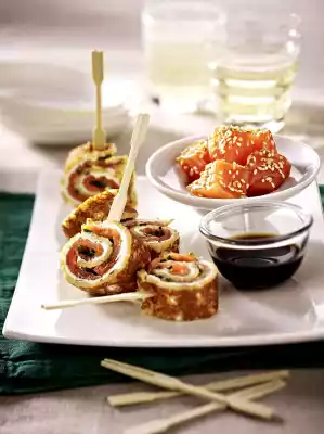 Unpack the crêpes and cut them into small rolls of about 1 cm width, put them on wooden skewers. Arrange salmon cubes and salmon rolls on plates. Add soy sauce