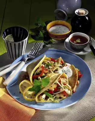 Heat 1 tablespoon of oil. Fry the prepared vegetables in it while turning. Season with salt and pepper. Stir in spice and soy sauce. Steam for about 5 minutes. Heat the remaining oil in a frying pan. Bake 2 pancakes from the dough one after the other and keep warm. Add parsley to the vegetables and season to taste again. Fill the pancakes with the parsley. Arrange on a plate with the mint sauce. Garnish with a slice of lemon and mint and sprinkle with pink berries