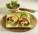 Heat the remaining oil in a frying pan. Bake 2 pancakes from the dough one after the other and keep warm. Add parsley to the vegetables and season to taste again. Fill the pancakes with the parsley. Arrange on a plate with the mint sauce. Garnish with a slice of lemon and mint and sprinkle with pink berries
