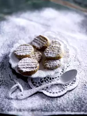 Carefully form the dough into 3 equal-sized rolls (approx. 3 cm Ø) and chill for approx. 2 hours. Cut into approx. 1 cm thick slices. Place on 2 baking trays lined with baking paper and press in lightly with the help of a fork crosswise. Bake in the preheated oven (electric cooker: 175 °C/ convection oven: 150 °C/ gas: see manufacturer) one after the other for 10-13 minutes. Remove and let cool off. Dust with icing sugar