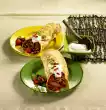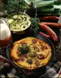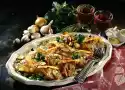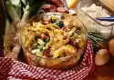 Mix chopped parsley and 1 egg into the cooled down meat mixture. Fill the pancakes with this mixture, roll them up, cut them diagonally into pieces about 4 cm wide and place them in a flat casserole dish. Mix the whipped cream with the remaining eggs, salt, pepper and nutmeg and pour over the pancakes.