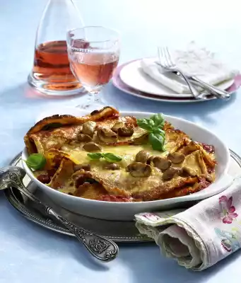 Roll up the pancakes. Repeat for the other pancakes. Put the rest of the tomato sauce in a greased pan and place the pancakes on top. Spread mushroom gorgonzola sauce over it. Bake in the preheated oven (electric cooker: 200 °C/ convection oven: 175 °C/ gas: level 3) for about 15 minutes. Garnish with basil