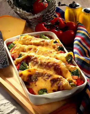 Mix flour, eggs, milk and a little salt to a smooth dough and let it swell for about 30 minutes. In the meantime, clean and wash the broccoli and divide into florets. Blanch in boiling salted water for about 8 minutes and drain. Cut the ham into strips. Heat some oil in a pan. Make four thin pancakes from the dough one after the other until golden brown. Spread broccoli and ham on the pancakes, season with nutmeg and roll them up. Grate cheese and mix with crème fraîche. Season the tomato pieces with salt and pepper and put them in a flat casserole dish (28x16 cm). Add rolled up pancakes. Spread the crème fraîche cheese cream on top and bake in a preheated oven (electric range: 200 °C/ gas: level 3) for 10-15 minutes