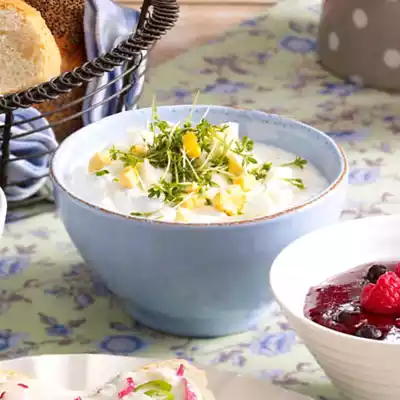 Drain the eggs, quench, chop and, except for something to garnish, add to the quark. Arrange the quark in a bowl, garnish with egg cubes and cress. Serve spreads with poppy seed plait and white bread.