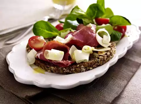 Slicing cheese. Crisply toast bread in hot butter. Cover with ham and cheese. Serve, garnish with salad.