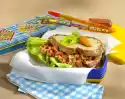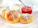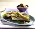 Chop almonds and pistachios and mix with cream cheese. Cover slice of crispbread with salad leaf. Spread cream cheese on all crispbreads. Drizzle with honey. Puree milk and raspberries in a blender. Serve the drink and crispbread garnished with lemon balm