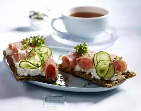Spread the cream cheese on both slices of crispbread. Wash the cucumber, cut it into slices, cut them in half and put them on the bread. Remove the fat from the edge of the salmon ham and roll up into rolls.