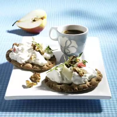 Cut quarters into cubes and fold into the quark. Spread the quark on the crispbread, sprinkle with nuts and garnish with thyme.