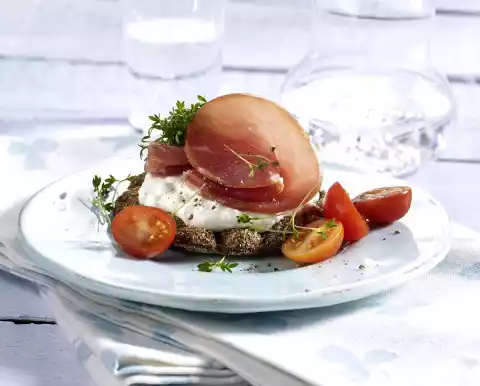 Cut cress from the bed. Wash and halve the tomatoes. Spread crispbread with cream cheese and cover with salmon ham. Sprinkle with cress and pepper. Add the tomatoes.