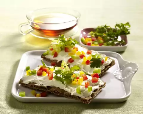 Spread slices of crispbread with cream cheese. Wash the bell peppers and cut into fine cubes. Clean and wash the frisée. Sprinkle diced paprika on the crispbread, season with salt and pepper and spread the salad on top.