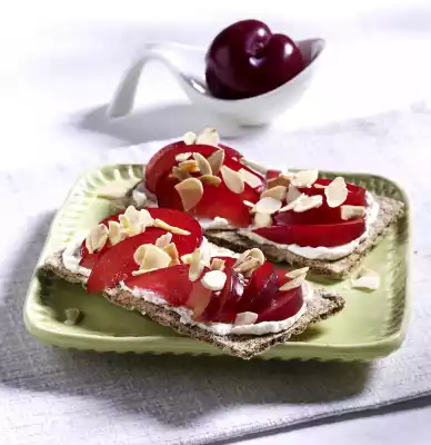 Spread crispbread with 1 teaspoon of cream cheese on each. Cut plums into thin slices and place them on the bread in a fan shape. Sprinkle with roasted almond flakes.