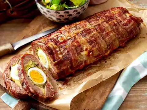 Peel the eggs and lay them down in the lower quarter on one long side in a row. Cover with the minced bacon mixture and form into a roll.