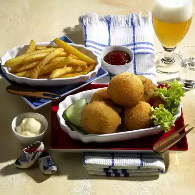 Turn the balls first in breadcrumbs, then in egg and again in breadcrumbs. There must be no cracks or holes in the breadcrumbs. Chill for about 1 1/2 hours. Heat the oil in a high pot or in the deep fryer to approx. 180 °C. Fry the balls in it in portions until golden brown. Drain on kitchen paper. Serve with french fries, salad, mayonnaise and ketchup