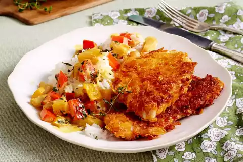 For the schnitzel, whisk eggs in a deep plate. Season schnitzel with salt and pepper. Turn in flour, egg and cornflakes one after the other. Press the cornflakes together. Heat 4 tbsp. clarified butter in a large pan and fry the escalopes in it in portions on each side for about 3 minutes. Serve with rice and sauce.