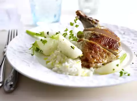 Take out the meat, cut into slices and serve with risotto and turnips. Sprinkle risotto with the rest of lemon peel and garnish plate with chervil.