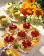 Form dough into a roll, cut into 6 pieces. Form each piece into a ball and roll out into a circle (approx. 13 cm Ø) on a little flour. Line the moulds with the dough and press them into the grooves. Prick the dough base with a fork more often