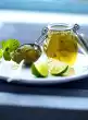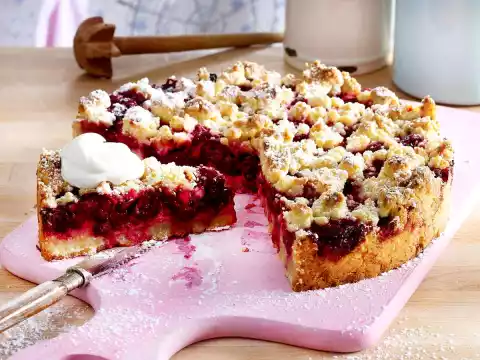 Mix crème fraîche with 1 tablespoon of sugar and sauce powder. Wash and stone the cherries. Mix with jam. Pour crème fraîche cream on the bottom and smooth it down. Add the cherries and spread the rest of the crumble on top.