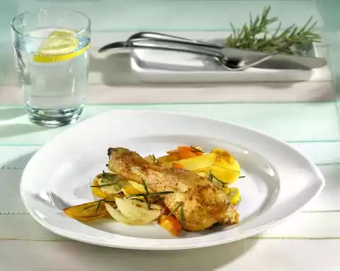 In the meantime, peel, wash and slice the potatoes, mix with 2 tablespoons of oil. After 10 minutes cooking time add to the chicken legs. Peel and wash the carrots. Halve lengthwise and cut into slices.