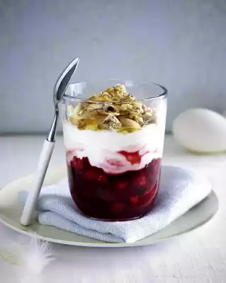 Roast the muesli mixture in a pan without fat until golden brown. Take out, let it cool down. Mix with honey. Mix sour cream, yoghurt, 2 tablespoons sugar and 1 packet vanilla sugar. Spread the sour cream over the berry compote.