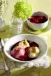 Bring fruit juice and 1 sachet of vanilla sugar to the boil. Stir the sauce powder with 3 tbsp. water until smooth and bind the fruit juice with it. Add undefrosted berries and 2-3 tbsp. sugar and bring to the boil again. Divide the compote into six dessert glasses.