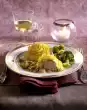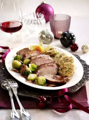 Pour the sauce through a sieve, bring to the boil again. Stir the starch with some water until smooth, thicken the sauce with it. Season sauce once more. Lift the napkin dumplings out of the water, remove from the aluminium foil. Cut the dumplings into slices and sprinkle with almond butter. Cut the duck into slices. Arrange everything together on a plate and garnish with physalis