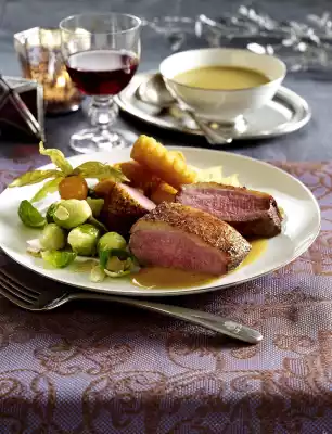 Clean and wash the Brussels sprouts. Wash the meat, dab dry. Season with salt and pepper. Heat oil in a large pan. Fry the duck breasts in it, first with the skin side for 5-6 minutes, turn and fry on the meat side for 3-4 minutes.