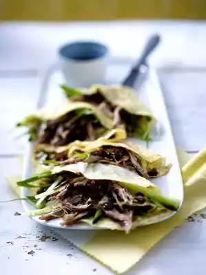 Take ducks out of the oven, peel off skin and cut into strips. Remove meat from the bone and pluck finely. Spread Hoi Sin sauce over the crêpes. Cover with duck meat, skin and vegetables and form crêpes into bags. Arrange on plates