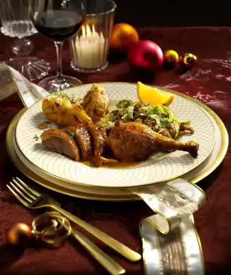 Keep the duck warm. Sieve the stock, degrease and bring to the boil. Stir starch and 3 tbsp. cold water until smooth, thicken sauce and season to taste. Cut the duck open. Serve everything. Serve with creamed savoy cabbage with chanterelles