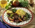 In the meantime stir dumpling powder into 1/2 litre water and let it swell for about 10 minutes. Knead about 1/4 of the dumpling mass with poppy seed. Form 8 small dumplings from the poppy seed mixture. Divide the remaining dumpling mixture into 8 pieces and form around the small dumplings. Cook the dumplings in boiling salt water for about 20 minutes. Take the duck out and keep it warm. Degrease roast stock and deglaze with poultry stock. Pour through a sieve into a pot and bring to the boil. Stir the starch with 1 tablespoon of water until smooth and thicken the stock. Season with salt and pepper. Arrange duck with red cabbage and dumplings on a plate and garnish with herbs. Serve with half apricots filled with redcurrant jelly