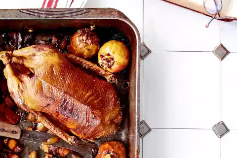 For the sauce, chill and degrease the frying stock for about 10 minutes. Fill up with water at 1⁄2 l. Stir starch with 3 tbsp. water until smooth. Bring the cooking stock to the boil, stir in the starch and simmer for about 2 minutes while stirring. Season with salt and pepper, keep warm. Carve the duck. Serve with sauce with red cabbage, dumplings and baked apples.