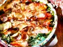 For the salad, wash the potatoes and cook in water for about 20 minutes. In the meantime, boil 2 eggs hard. Drain potatoes and eggs, rinse and peel. Cut potatoes into slices and let them cool down.