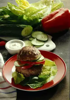 Wash, clean and slice the vegetables. Season with salt and pepper. Clean, wash and drain the salad. Cut open bread rolls, spread with crème fraîche, layer hamburgers and spiced slices of pepper and cucumber in between. Serve immediately on romaine lettuce leaves