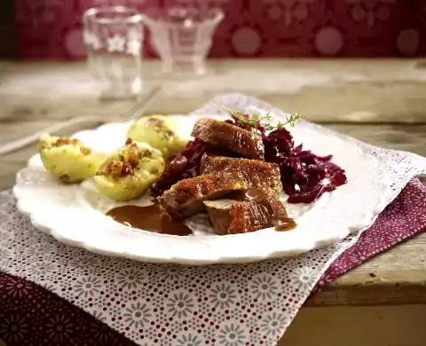 Season red cabbage with salt, pepper and sugar. Remove meat from the bone and cut open. Drain dumplings. Serve everything