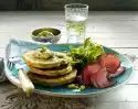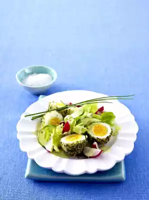 Take out and drain on kitchen paper. Mix salad, cucumber slices and radishes with the yoghurt-mustard sauce. Halve the eggs and arrange on plates with the salad. Garnish with chives.