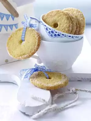 Preheat oven (electric cooker: 175 °C/circulating air: 150 °C/gas: see manufacturer). Line two baking trays with baking paper. Cut dough rolls into slices of approx. 1⁄2 cm width and place them on the baking trays.