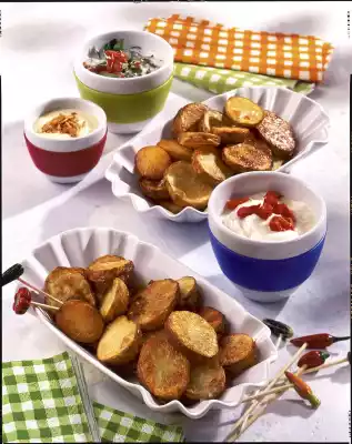 Wash the potatoes and cut into thick slices. Mix with oil. Place on a baking tray lined with baking paper. Salt the potatoes. Bake in a preheated oven (electric cooker: 225 °C/ convection oven: 200 °C/gas: level 4) for about 20 minutes until golden brown. Turn over from time to time