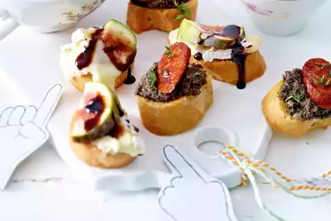 Wash and halve the figs and cut them into thin slices. Cut the Brie into about 15 slices. Cover half of the baguette slices with brie and figs. Sprinkle with balsamic syrup. Spread the rest of the baguette with tapenade and cover with chorizo.