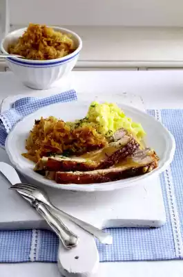 For the sauerkraut, peel and chop the onion. Heat the oil in a pot. Fry the onion in it. Add sauerkraut and apple juice. Season with salt, pepper and paprika. Bring to the boil and braise covered for about 30 minutes.
