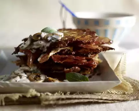 Fry the ham in a pan without fat until crispy. Remove. Heat 1 tablespoon of oil in the pan. Fry 3 rösti on each side for 2-3 minutes until crispy. Remove and keep warm in a hot oven (approx. 50°C).