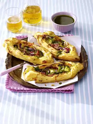 Spread the dough with sour cream, leaving a small rim on each. Spread broccoli on top. Season with salt and pepper. Spread bacon and onion over it. Sprinkle with cheese. Bake in a hot oven for about 20 minutes.