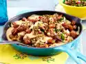 Cut the broccoli into very small florets, wash and drain. Peel the onion and cut into strips. Cut the bacon into pieces.