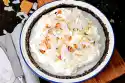 Preheat oven (electric cooker: 250 °C/ circulating air and gas: not suitable!) Line two baking trays with baking paper. Spray approx. 24 choux pastry blobs (approx. 5 cm Ø each) onto the baking trays