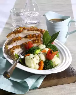 Season to taste with salt, pepper and a little sugar. Remove the finished roast from the tray and wrap in aluminium foil. Dissolve the roast with 450 ml water. Pour through a sieve and bring to the boil. Stir in sauce powder, bring to the boil and simmer for 1 minute.