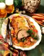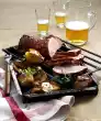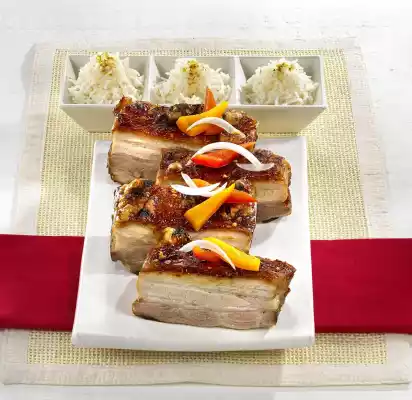 Place the meat in the marinade and marinate covered, preferably overnight in the refrigerator. Remove meat from the marinade and place on a baking tray. Cook in a preheated oven (electric cooker: 200 °C/ convection oven: 175 °C/ gas: level 3) for approx. 1 1/2 hours. Spread the rest of the marinade on the rind and crisp up for another 10 minutes (electric cooker: 225 °C/ convection oven: 200 °C/ gas: level 4). Cut meat into pieces and serve garnished with colourful slices of paprika and onion. Basmati rice tastes good with it