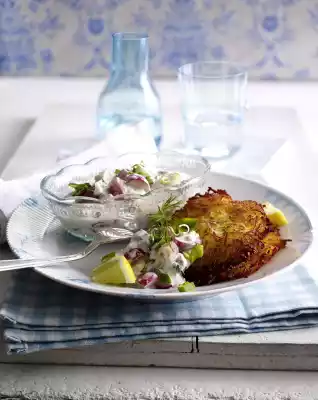 Rinse the maties, dab dry and cut into pieces. Wash radish and cucumber and cut into pieces. Clean and wash spring onions and cut into rings. Mix yoghurt and sour cream. Season with salt, pepper and 1 pinch of sugar. Wash the dill, shake dry and chop finely, except for something for garnishing. Stir into the yoghurt sauce. Fold in the radishes, spring onions, cucumber and the maties. Arrange the rösti and matie salad on plates. Garnish with lemon wedges and the rest of the dill
