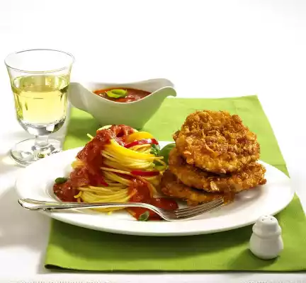 Remove from the pot and put aside. Sweat tomato paste, onion and garlic in hot frying fat. While stirring, deglaze with stock and chunky tomatoes. Add drained paprika. Bring to the boil and simmer for 1 minute. Season with salt, pepper and 1 pinch of sugar and puree everything. Keep sauce warm. Prepare spaghetti in boiling salted water according to package instructions. In the meantime, wash the cutlets, cut them into thirds and beat them a little flatter. Beat the egg and 2 tablespoons of water in a deep plate. Pour the corn flakes onto another plate. Press with your hand so that the Corn flakes crumble. Turn the cutlets in the beaten egg and the Corn flakes and press them lightly. Heat the oil. Fry the escalopes briefly on each side.