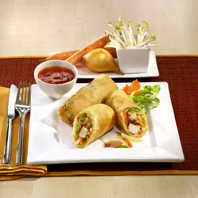 Place 2 pastry sheets on top of each other. Spread the filling on top. Wrap sides inwards, roll up. Heat 1/2 l oil in a pot or deep frying pan. Fry the spring rolls in it in portions for about 5 minutes. Drain. Serve with the rest of the Asian sauce