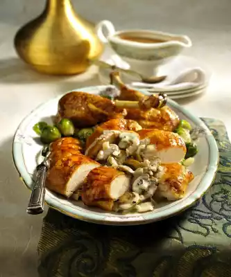 Put the Brussels sprouts in boiling salted water and cook for about 20 minutes. Heat oil in a pan and fry onions until translucent. Remove from the pan and put aside. Add the mushrooms to the frying fat and fry them vigorously while turning. Add onions again. Add truffle butter, melt and deglaze with cream. Stir in crème fraiche, bring to the boil and let it boil down for 5-7 minutes at low heat. Season to taste with salt, pepper and sugar. Remove the turkey from the fat pan, cover and let it rest for a while. In the meantime pour gravy through a sieve into a pot, bring to the boil. Stir in sauce thickener, bring to the boil again, simmer for 1 minute and season with salt and pepper. Carve the turkey. Arrange turkey, truffle cream and Brussels sprouts on a plate. Add sauce extra